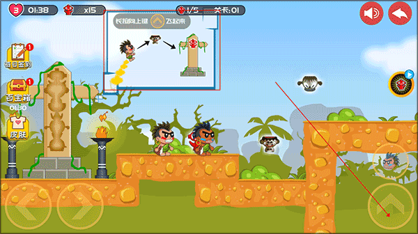 屁王兄弟双人版是一款妙趣横生的双人冒险小游戏。在原始村庄,因常吃地瓜,村民们都掌握了放屁飞天的神奇技能。某天,守护村庄的图腾离奇失踪,屁王兄弟杰克和东尼临危受命,开启寻图大冒险。游戏共 20 关,需他俩默契配合,巧用放屁飞越高山、躲避陷阱、绕过野兽,收集散落各处的宝物图腾并放置到祭台,方能闯关成功。轻松诙谐的风格,新奇独特的玩法,让人乐在其中。