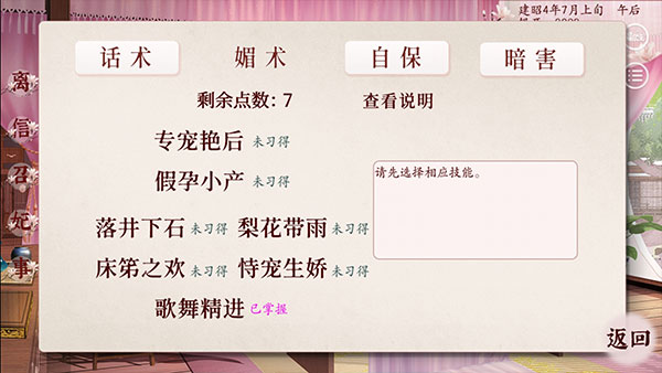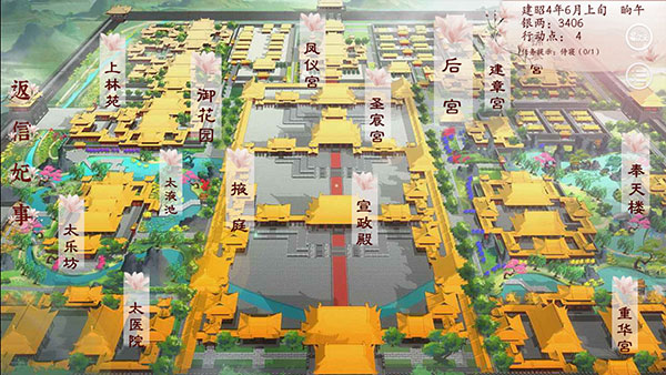 2、学完技能就离开寝宫,大地图先去【掖庭】——【挑选宫女】,双属性宫女可以先收,不消耗行动点。随后回到大地图,去【建章宫】刷太后好感,一旬去四次,直到好感100。尤其是擅权太后,若先高宠而太后好感低会被禁足。侍寝在傍晚存档刷,若未侍寝深夜可剩余1行动点,先练习音律或者找妃子争锋。大礼包满属性读者开局刺绣100,在【御花园】御有几率被太后夸赞绣品,好感+。低福源在【掖庭】遇到潇潇劝她跟太后,太后好感+10注意:体质≥800一旬有5点行动点,体质<800的主控们,一旬只有4点,所以开局体质≥800比心计重要。