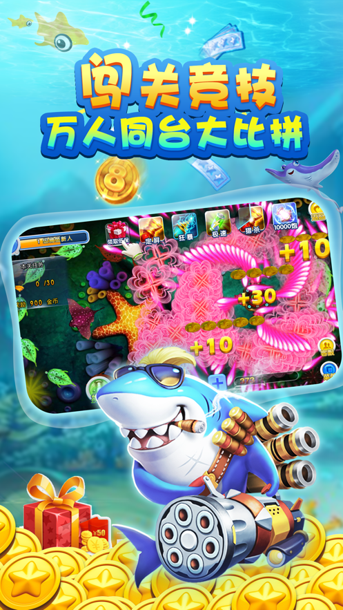 奇幻的风格、精致亮丽的画面,船舰轻松跑的快,全新闯关玩法,勇闯鲨鱼阵,KO海怪BOSs,过五关抓六将,痛痛快快成 为捕鱼之王!