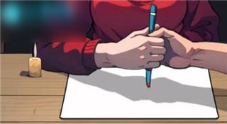 随后把桌子滑动两次,接着用笔拧开两颗螺丝,输入下图里的符号号码,这样就能驱散笔仙了。