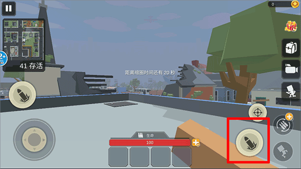 选择好降落地点后,会进行降落,到达地面后要注意,周边是有很多敌人的,红色方框内的按钮是射击。